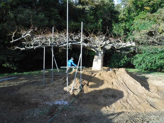 「藤のガーデン」の22本の藤の大木は、富士山麓の個人宅に植わっていた木を赤塚植物園が譲り受けたものです。枝と根を広く伸ばした藤の大木を掘り起こし、約370kmも離れた三重県津市へ搬送し移植作業はこれまでに経験した業者もなく、困難の多い一大プロジェクトでした。2017年より約3年かけて順次移植し、1本も枯らすことなく名木を定着させることに成功。2021年より「藤のガーデン」として公開を開始しました。