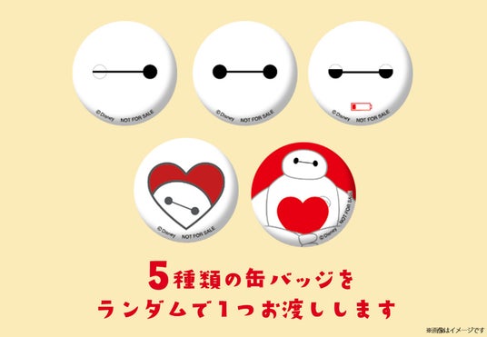 『ベイマックス/りんごケーキ』の誕生を記念して、対象店舗で『ベイマックス/りんごケーキ』のお菓子・グッズを含む税込2,000円以上お買い上げのお客様に先着で缶バッチをおひとつプレゼント!全5種よりランダムでお渡しするので、どのデザインに出会えるかお楽しみに。