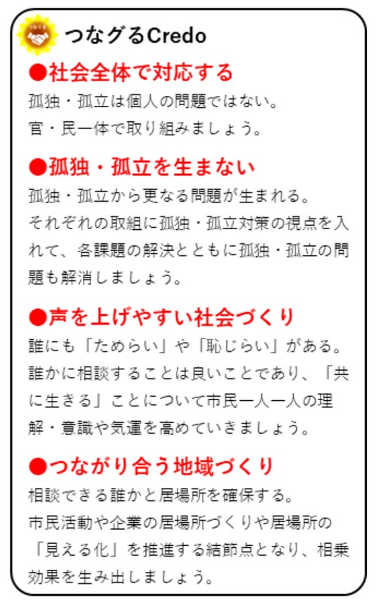 ▶︎ 豊田市の孤独・孤立対策の考えを、4本の柱にまとめた「つなグるCredo」
