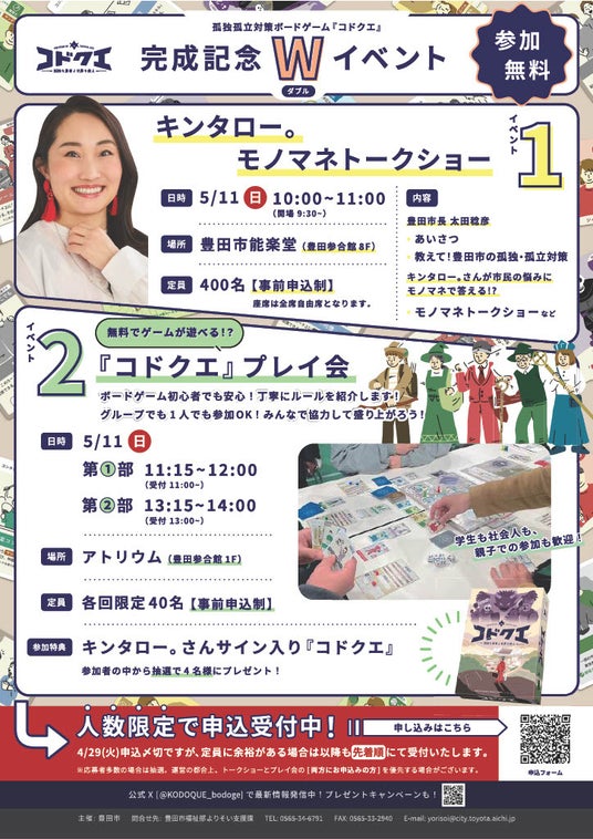 孤独・孤立対策強化月間である5月にあわせ、5月11日(日曜日)10時より、豊田参合館にて、ゲストにキンタロー。さんを迎えたトークイベントと「コドクエ」のプレイ体験会を開催します。参加費は無料で、トークイベントは400名様、プレイ体験会は80名様でいずれも事前申込制です。お申し込みは本日から4月29日(火曜日)まで、申し込みフォームにて受け付けます。