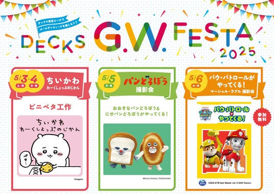 東京・お台場の商業施設「デックス東京ビーチ」(以下、当館)では、ゴールデンウィークにあたる2025年5月3日(土・祝)から5月6日(火・休)の4日間の期間限定でワークショップや撮影会イベントが楽しめる「DECKS G.W. FESTA 2025」を開催します。