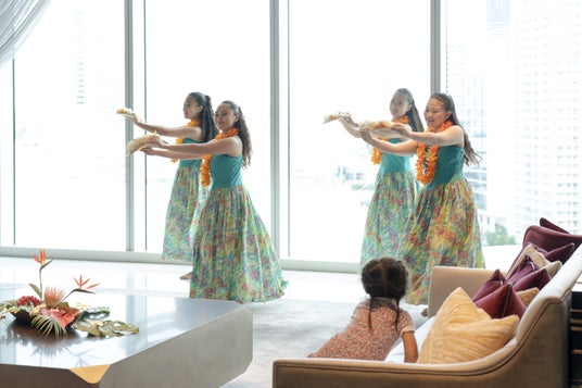 海の音や青空を連想させるような、ゆったりとしたハワイアンミュージックとともに、プロによるフラダンスショーを楽しむひととき。みなとみらいの絶景を一望できるスカイロビーが、温かくやさしい雰囲気に包まれます。