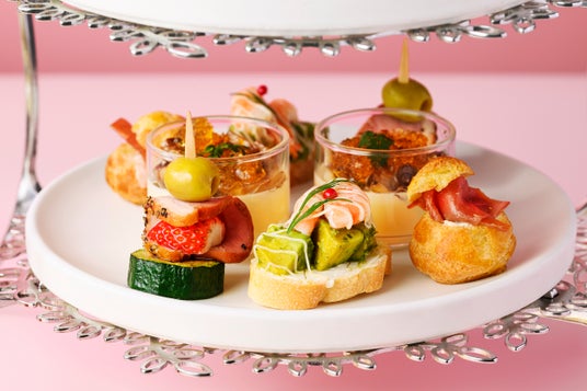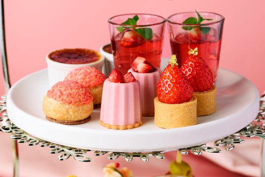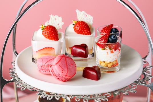 1段目と2段目には、苺のショートケーキやタルト、ムースをご用意。また、苺ミントジュレやパッションのチョコレート等、さっぱりと味わえるスイーツも合わせてお楽しみいただけます。3段目のセイボリーは、冷製キノコとコンソメのロワイヤルや合鴨と季節のフルーツのピンチョスなど、一口サイズで食べやすく見た目も華やかに仕上げました。
