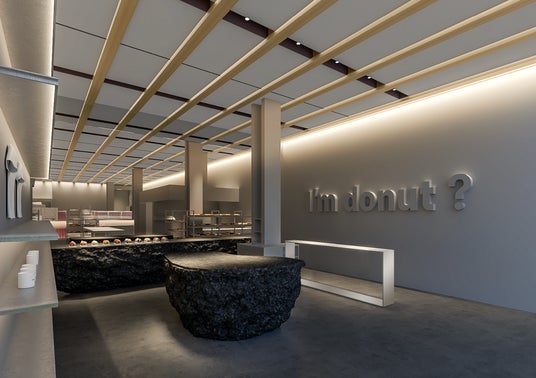 店内は日本らしさを感じられる洗練された“和”をコンセプトに空間を演出。街の賑やかさとは一変して、私たちのドーナツの世界に没入してもらえるように、わびさびを意識した洗練されたデザインになっています。特に、ニューヨーク州の採石場から採取した大きな天然石を使ったカウンターや、目を引く外観の巨大な「I'm donut?」の看板には注目です。