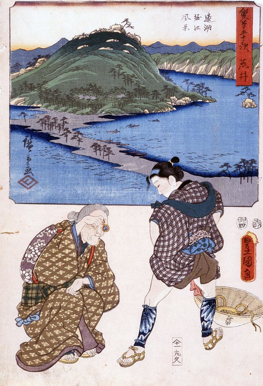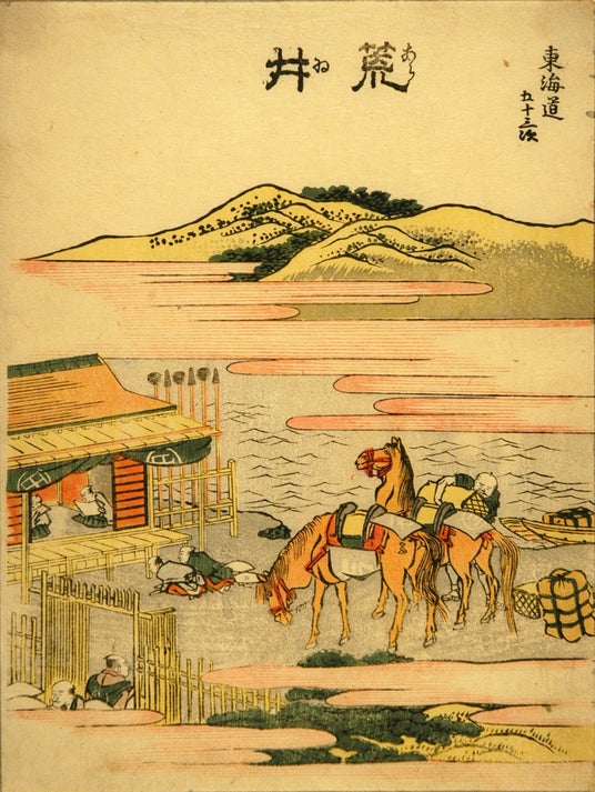 葛飾北斎が描く今切(新居)関所の風景です。この関所は、吉田藩が幕府から管理を委任されていました。