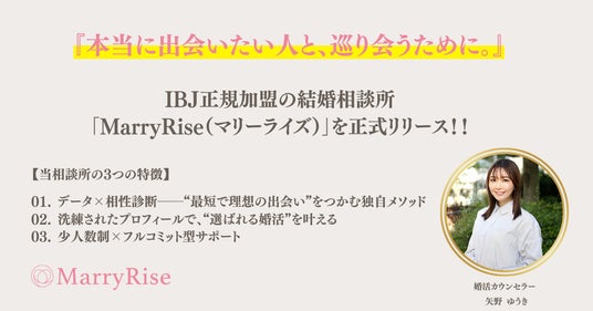株式会社MentarRise(本社:東京都渋谷区、代表取締役:鈴木寿治)は、新規事業として東証プライム上場企業|株式会社IBJ正規加盟店の結婚相談所 「MarryRise(マリーライズ)」を4月10日より正式リリースいたしました。