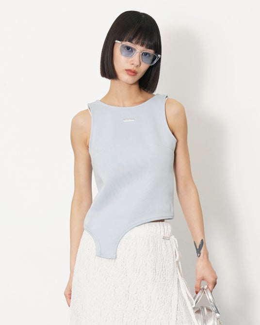 モードなボートネック×オープンバックが、大人のヘルシーさを引き出す一枚。クロップド丈でボリュームボトムとも好相性。程よいゆとりがありつつ、インナーを選ばず着られる万能シルエット。夏にちょうどいい素材感と、メタルプレートのアクセントで、こなれたスポーティスタイルが完成。