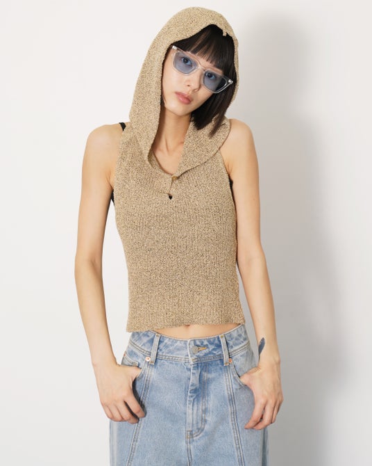 大胆な背中開きに、カジュアルなビッグフーディを掛け合わせたギャップが魅力。ドライタッチで盛夏も快適に、メランジ素材の表面感が今っぽい印象に。インナー次第で雰囲気を変えられるので、着回しも自在。シンプルなデニム合わせでもサマになる、主役トップス。