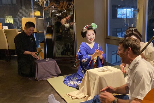 公演後は、わずか8席のみのプライベートな空間で、厳選された京野菜、新鮮な海鮮、薩摩黒毛和牛を贅沢に使用したおまかせコース料理をご堪能いただきます。ディナー後半には、舞妓さんが合流し、舞やお座敷遊びを愉しんでいただけます。