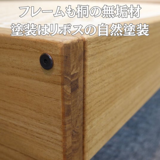 この桐ベッドは、布団との接地面を最小限に抑える通気構造と、 桐本来の調湿性能を掛け合わせることで、寝具の下に湿気を溜めにくくします。