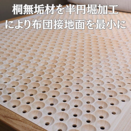 布団との接地面を最小限に抑える通気構造この桐ベッドは、布団との接地面を最小限に抑える通気構造と、 桐本来の調湿性能を掛け合わせることで、寝具の下に湿気を溜めにくくします。