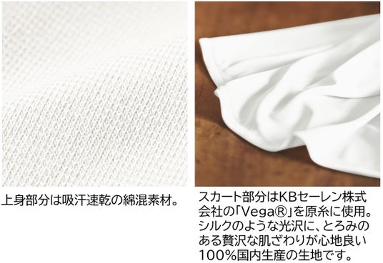 70cm丈はお腹周りを冷やさないように、裾が二重仕様。外側のスカート部分は静電気防止効果もあるなめらかな素材を使用し、内側は綿混素材で身体にフィットする作りになっているので、ボトムスへのインもできて安心感があります。