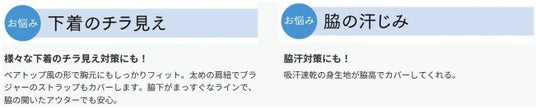 透けや汗ジミが気になりやすい時期に、スリップは欠かせないアイテム。袖の短い洋服や透け感がある洋服を着る機会が増えると、ブラジャーがインナーの袖口や胸元、肩紐からハミ出てしまわないか、気になる方も多いのではないでしょうか。そんな様々なお悩みを1枚で解決できれば、より便利で快適になるのではと思い開発しました。