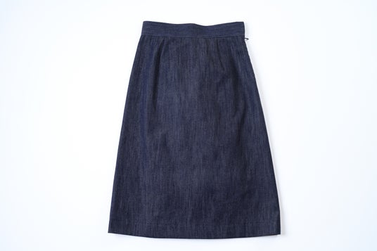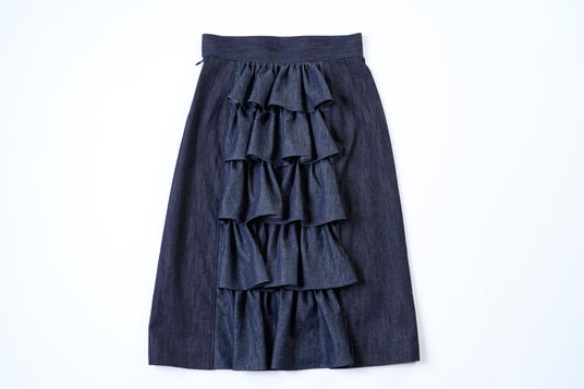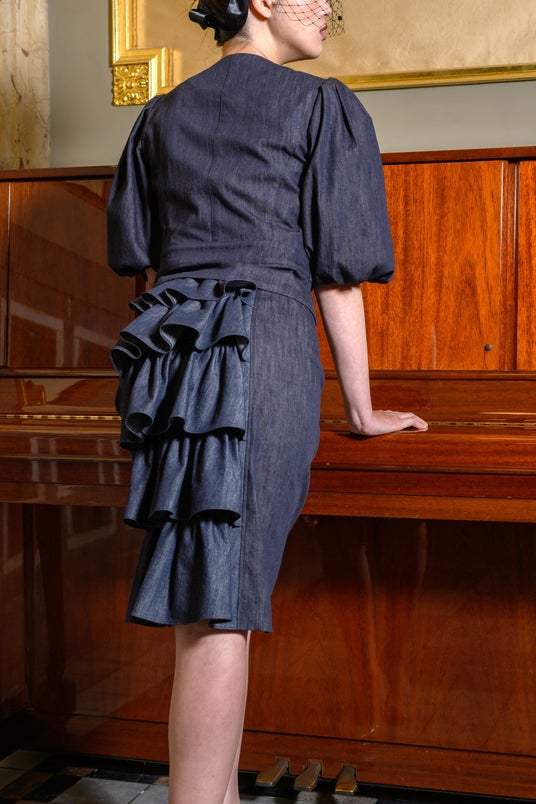 19世紀のバッスルスタイルにインスパイアされたデザイン。後ろのボリューム感と前のシンプルさが特徴です。ワンウオッシュの児島デニムを使用し、柔らかな素材と豊かなギャザーが立体的なティアードを生み出し、エレガントな印象を与えます。