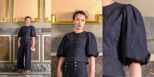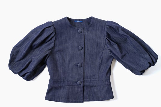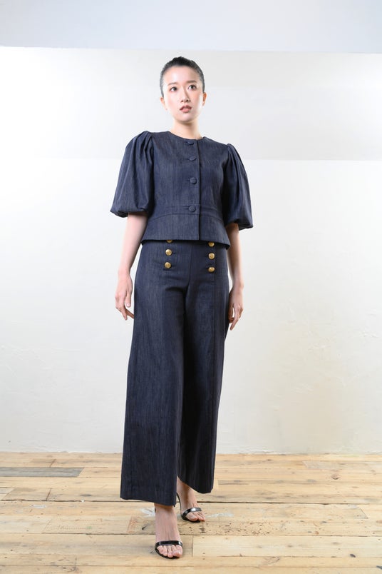 1950年代風のクチュール感が漂うデニムジャケット。女性の体の曲線美を引き立てるデザインで、袖のボリュームと身頃のフィット感が際立ちます。