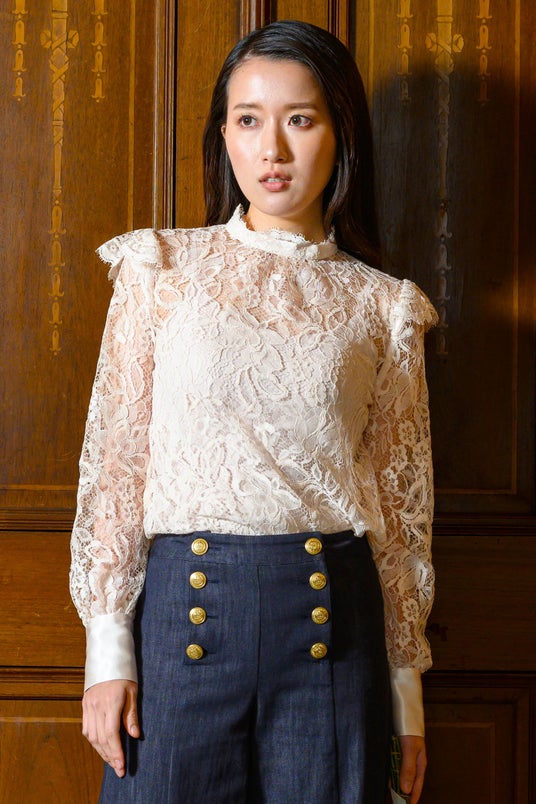 贅沢に希少なリバーレースを用いた特別な一着。繊細で軽やかな生地を生かしたショルダーフリルが特徴的で、襟元と裾のスカラップがタイムレスな美しさを引き立てています。