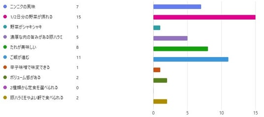 最も多くの票を集めたのは『1/2日分の野菜※が摂れる』というポイントでした。2位は『ご飯が進む』、3位は『たれが美味しい』でした。にんにくの風味と豚ハラミの濃厚な旨味、たっぷり野菜のシャキシャキ食感を一度に楽しめる、満足感たっぷりの一品をぜひご堪能ください。
