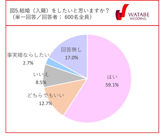 次に、「結婚(入籍)をしたいと思いますか?」という問いに答えてもらったところ、約6割の人が「はい」(59.1%)と回答しました。「どちらでもいい」(12.7%)と考える人が約1割、「いいえ」(8.5%)と答えた人が約1割、「事実婚ならしたい」(2.7%)と考える人が少数いました。(図5)