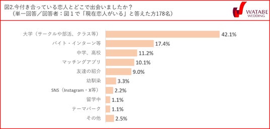 出会った場所は「大学(サークルや部活、クラス等)」が約4割、「マッチングアプリ」は約1割に。