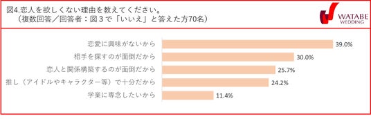 「いいえ」と答えた人に、恋人が欲しくない理由を聞いたところ、約4割が「恋愛に興味がないから」(39.0%)と考えていることが分かりました。(図4)