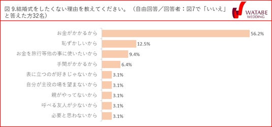 さらに、「結婚式はしたいですか?」(図7)という設問で、「いいえ」と答えた人に、「結婚式をしたくない理由を教えてください。」と尋ねたところ、5割以上が「お金がかかるから」(56.2%)と答えました。「恥ずかしいから」(12.5%)と考える人も1割以上いることが分かりました。(図9)
