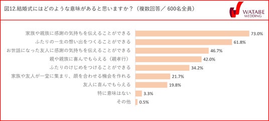 「結婚式にはどのような意味があると思いますか?」という設問に答えてもらうと、7割以上の人が「家族や親族に感謝の気持ちを伝えることができる」(73.0%)と回答したほか、約6割が「ふたりの一生の想い出をつくることができる」(61.8%)と答えました。(図12)