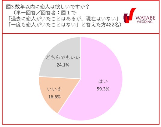 さらに、交際経験について尋ねた設問(図1)で「過去に恋人がいたことはあるが、現在はいない」「一度も恋人がいたことはない」と答えた人に、「数年以内に恋人は欲しいですか?」と尋ねると、約6割が「はい」(59.3%)と答えました。「いいえ」(16.6%)と回答した人は約1割でした。(図3)