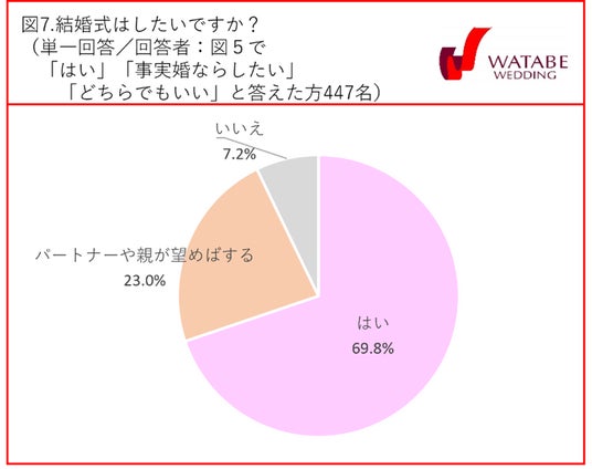さらに、「結婚(入籍)をしたいと思いますか?」(図5)という問いに「はい」「事実婚ならしたい」「どちらでもいい」と答えた人に、「結婚式はしたいですか?」と尋ねたところ、7割近くが「はい」(69.8%)と答えました。「パートナーや親が望めばする」(23.0%)と考える人も2割以上いることが分かりました。(図7)