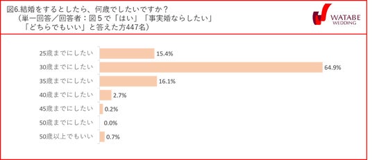 続いて、「結婚(入籍)をしたいと思いますか?」(図5)の設問に「はい」「事実婚ならしたい」「どちらでもいい」と答えた人に、結婚するなら、何歳でしたいかを答えてもらったところ、「30歳までにしたい」(64.9%)が最も多いことが分かりました。「25歳までにしたい」(15.4%)と答えた人と合わせると、30歳までにしたいと考える人は約8割にのぼりました。(図6)