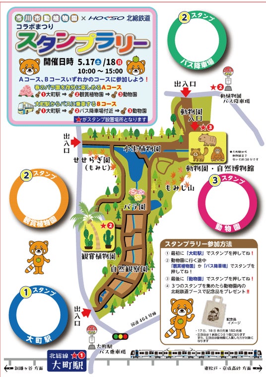 今回は市川市動植物園をよりお楽しみいただける企画として初のコラボスタンプラリーを実施します。見頃を迎える観賞植物園に咲き誇る約110種、934株の多彩な春バラを巡りながらイベント会場に足を運んでいただけるAコース。イベント当日運行する北総線・大町駅と市川市動植物園を結ぶ無料臨時送迎バスに乗車して参加できるBコースの2コースをご用意しました。異なるスタンプを3つ集めてイベント会場へチラシをお持ちいただくと、各日先着150名様にスタンプラリーでしか手に入らない「市川市×北総鉄道コラボトートバック」をプレゼント。