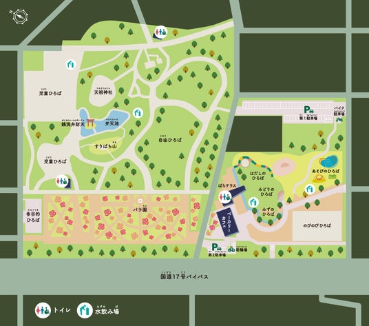 今回のリニューアルで、おいしいパンを食べながらゆっくり過ごせる「ベーカリーカフェ」、公園のシンボルでもあるバラ園を一望できる「ばらテラス」、与野公園オリジナルの遊具などがある「あそびのひろば」が整備されました。
