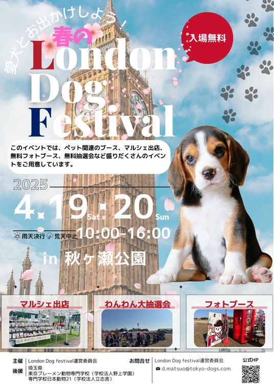 2025年4月19日(土)・20日(日)の10:00から16:00まで、埼玉県さいたま市の秋ヶ瀬公園にて、愛犬と飼い主が共に楽しめる体験型イベント「London Dog Festival」を初開催いたします。