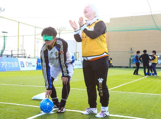 【写真左】東京都内の会場で実施されたノービジョン・ダンジョン(錦城護謨提供)、【写真右】ブラインドサッカー(R)の体験教室(C)Haruo.Wanibe/JBFA