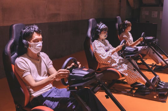 映像を使わず音だけで楽しむレーシングゲーム「大爆走!オーディオレーシング」。万博の催し会場にも設置される(撮影:丸尾隆一)