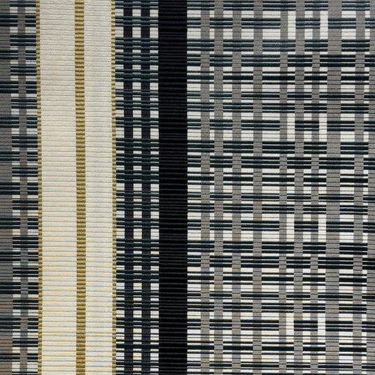 ●福岡県知事賞「有来間道(うらいかんとう)」白、紺藍、金茶、うす鼠色の経縞(たてじま)に浅葱色の緯縞(よこじま)をランダムに配した格子柄が印象的。博多織の原点ともいえる間道柄を、博多織の中でも希少性が高く、幻の織物といわれる総浮(そううけ)の技法を採用して織り上げた究極の袋帯です。