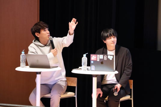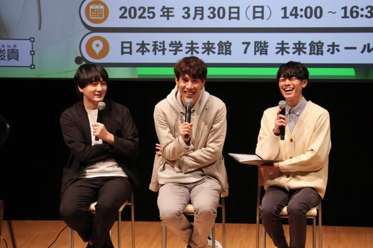 今回のイベントにはQuizKnockの須貝駿貴、田村正資、東言が登壇。司会の東言による進行のもと、ともに東京大学大学院で博士号を取得し、研究活動に馴染みの深い須貝と田村が質問役を務めました。