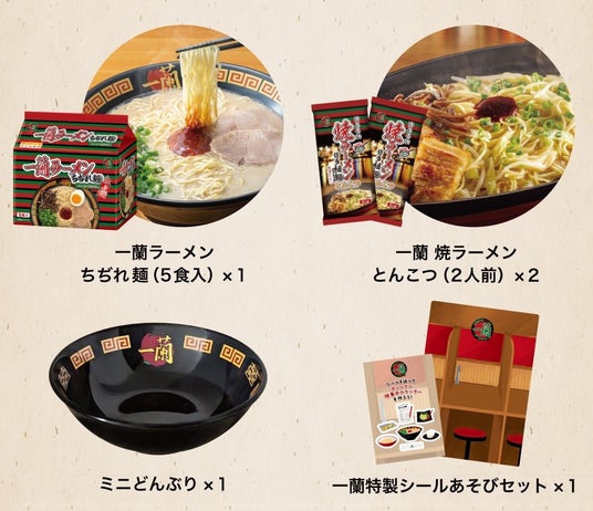ご家庭でも一蘭の味をお楽しみいただける、ミニどんぶり付きの特別なセットをご用意しました。麺がスープによく絡む「一蘭ラーメン ちぢれ麺」に加え、フライパン一つで簡単に調理ができる「一蘭 焼ラーメン とんこつ」も入った、ご家族みんなで楽しめるラインナップです。