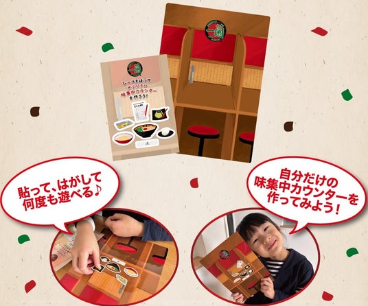 一蘭オリジナルのシール台紙のデザインは、元祖「味集中カウンター」。好きなところにシールを貼って、自分だけの味集中カウンターをつくることができます。シールははがしやすい素材で、貼ってはがして何度でも遊ぶことができます。
