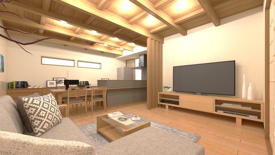 ■材の梁をそのまま見せた 現し天井リビングは「現し天井」となっており、天井仕上げを設けずに梁をあらわしにすることで、開放感のある高い天井を実現しています。木材は経年変化によって風合いが増し、お子様の成長とともに家の表情も変化していくため、長く愛される空間となります。また、多くの県産材を使用した木製カウンターを採用しています。木材にはリラックス効果があるとされ、自然の温もりを感じながら暮らしていただける点が大きな魅力です。