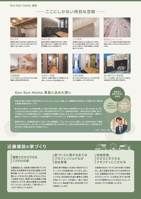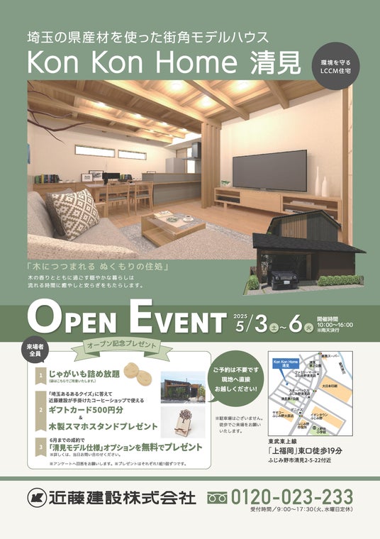近藤建設株式会社(本社:埼玉県ふじみ野市、代表取締役社長:宇佐見 佳之、以下「近藤建設」)は、地域経済の活性化や持続可能な雇用創出などを目的に、埼玉県産木材「秩父檜」を使用したモデルハウス「Kon Kon Home 清見」を2025年4月26日プレオープン、2025年5月3日にグランドオープンいたします。