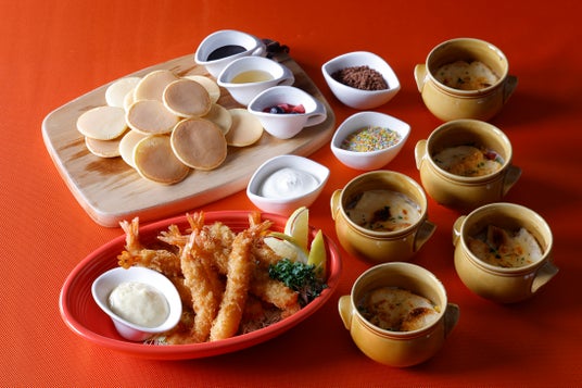クラムチャウダーのココットチーズ焼き/海老フライ/ローストビーフ(ランチ)/握り寿司(ディナー)/ミニパンケーキ