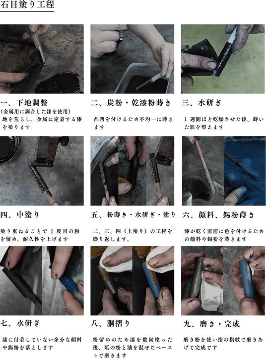 吸水性、乾燥性が低く、漆塗り加工には不向きと言われてきた金属の表面に、使用する材料の選定や調合、下塗り方法の変更、その他加工工程の変更など数年に渡る試行錯誤を繰り返し、ようやく金属への漆塗りを可能としました。地の金属筆記具に施した温かみのある「石目塗り」の触感は唯一無二です。