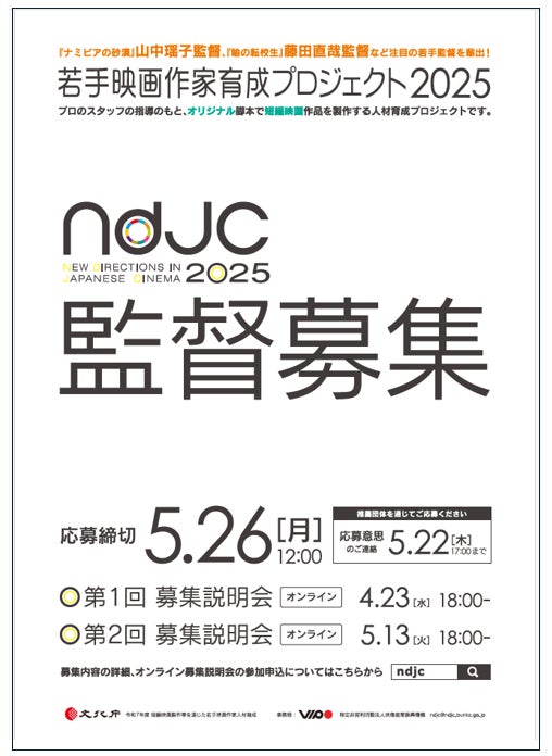 文化庁委託事業「ndjc:若手映画作家育成プロジェクト2025」(正式名称:令和7年度 短編映画製作等を通じた若手映画作家人材育成)は、本年度の参加監督を募集します。