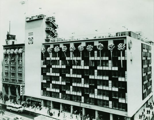 悲願であった銀座三丁目の一区画全てを占める大規模な増築を行い、新装開店しました。合わせて、松屋のマークや包装紙などのデザインを一新しました。そのデザインは、日本デザインコミッティーのメンバーでもあったグラフィックデザイナーの亀倉雄策氏によるもので、ダイナミックな創作書体を用いたものでした。