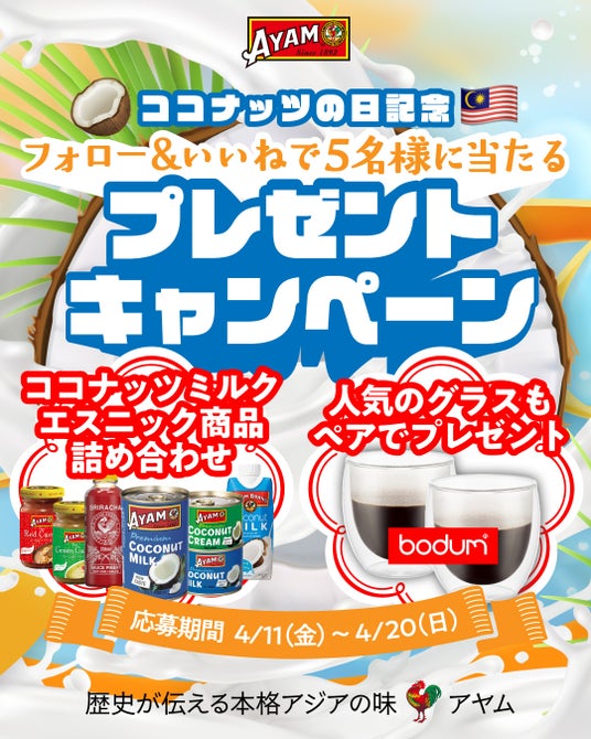 マレーシアの国民的ブランド「Ayam(アヤム)」は2025年4月11日(金)~2025年4月20日(日)の期間中、Instagramキャンペーンを開催いたします。当選者の5名様にはココナッツミルクを中心としたこだわりのエスニック食材の詰め合わせを、ココナッツミルクで作るデザートやスムージーなどにもぴったりの人気ペアグラスとセットにしてお届けする予定です。
