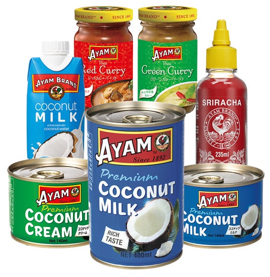 アヤムとは本国マレーシアで高い知名度を誇るエスニック食材のブランドです。グリーンカレーが手軽に作れるペーストやタイの万能調味料シラチャーソースなどはもちろん、東南アジアで日常的に食されるココナッツミルクだけでも種類豊富に展開しています。
