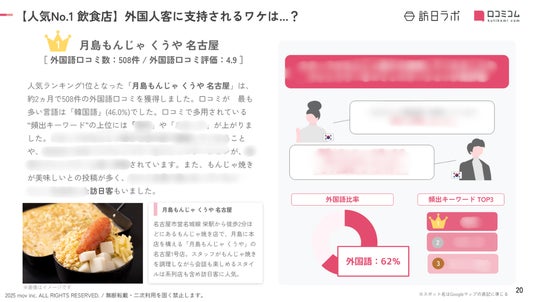 業界最大級のインバウンドビジネスメディア「訪日ラボ」及び 店舗向け集客一元化プラットフォーム「口コミコム」を運営する株式会社mov(代表取締役:渡邊 誠、本社:東京都渋谷区、以下mov)は、名古屋エリアの飲食店に寄せられた最新の口コミデータから、独自の『インバウンド人気飲食店ランキング』を発表しました。