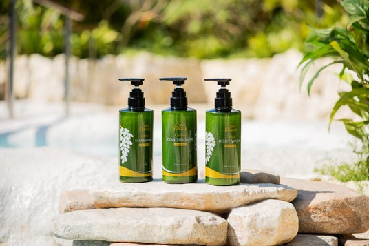 スパ ジャングリアでは、沖縄県産の月桃精油100%を原材料として使用したアメニティを使用しています。沖縄では「ムーチー」と呼ばれる健康を祈願して食される旧暦行事のお菓子を、抗菌作用のある月桃の葉で餅を包むことが伝統となっています。月桃は沖縄固有の有用植物で昔から親しまれているものの、価値は商業化されておらず、多くの人がその価値を知る機会がない課題があり、ジャングリア沖縄を通して地域の価値を消費者の価値に変えるアイテムとして、生産工程の全てが沖縄で完結するスパ ジャングリア オリジナルの8つのアメニティが誕生しました。