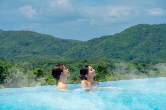 有機的な曲線が美しいお風呂は屋内にいながらも、屋外のさわやかな空気を感じる開放的な空間です。ジャングリア沖縄の地下に湧く天然温泉、神秘的な洞窟風呂、ジェットバスなど様々な種類のお風呂をお楽しみいただけます。地下1,600mから湧き出す天然温泉「今帰仁の湯」は、美肌の湯として知られるアルカリ性単純温泉で、肌をなめらかに整え、湯あたりが優しく、幅広い年代の方が利用しやすい泉質です。南国リゾートの非日常な空間と温泉の癒しの時間を提供します。
