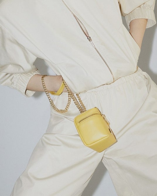 キューブ型タイプは、イエロー、ピンク、レッド、ホワイト、ゴールド、ブラックの6色展開。アクセサリー感覚でコーディネートに彩りを添えるほか、セカンドバッグとしてもおすすめです。